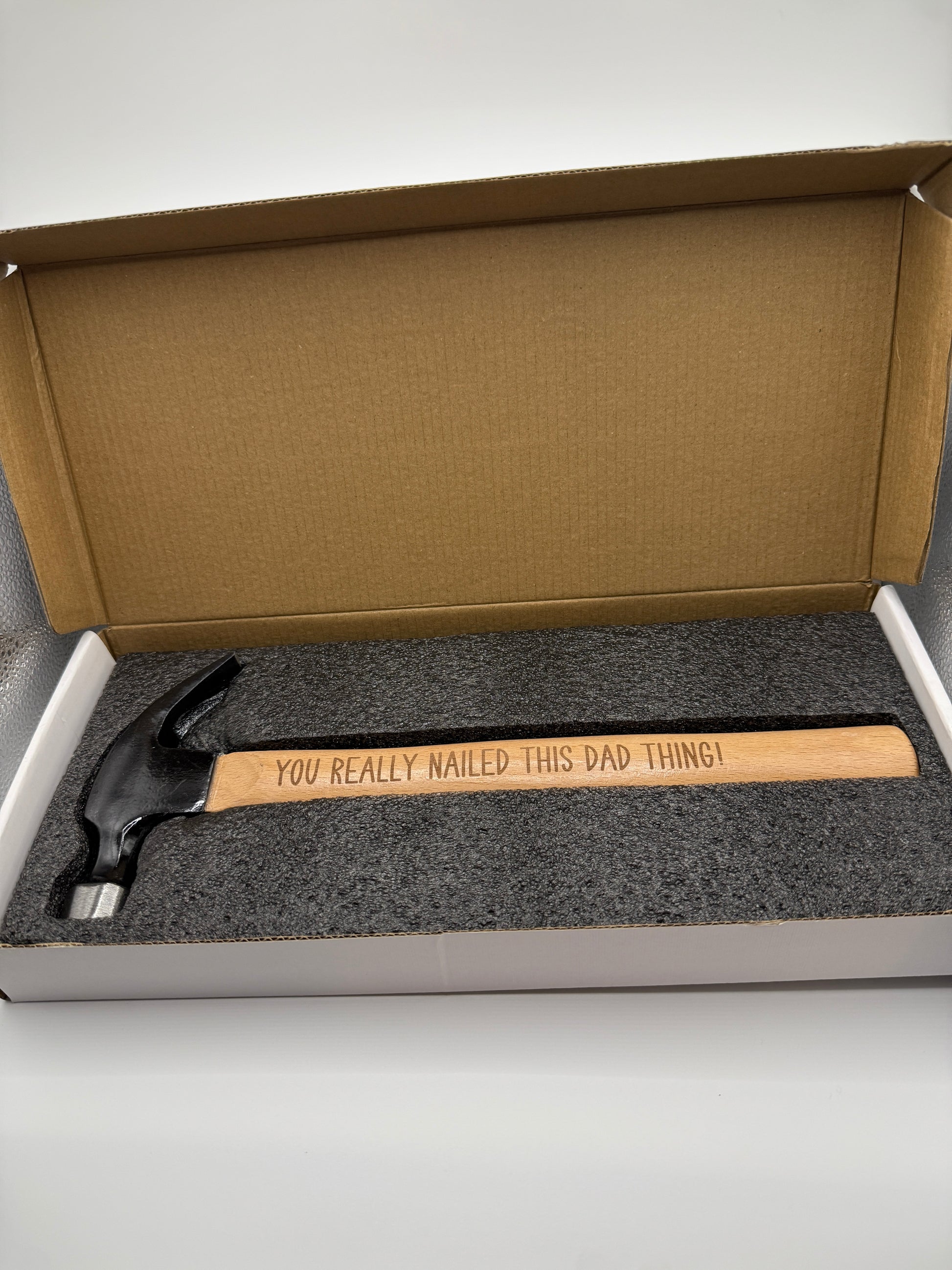 This 16 oz. hammer measures 12.5" x 5.25" x 1.25" and has a steel hammer head. It is easily personalized with the phrase of your choice, or choose a provided option. Comes individually packaged in a white box ready for gift-giving!